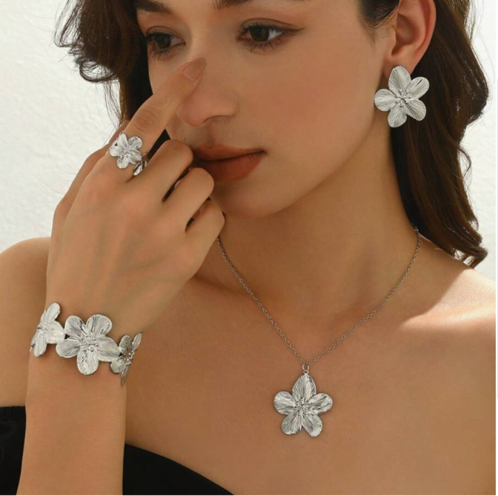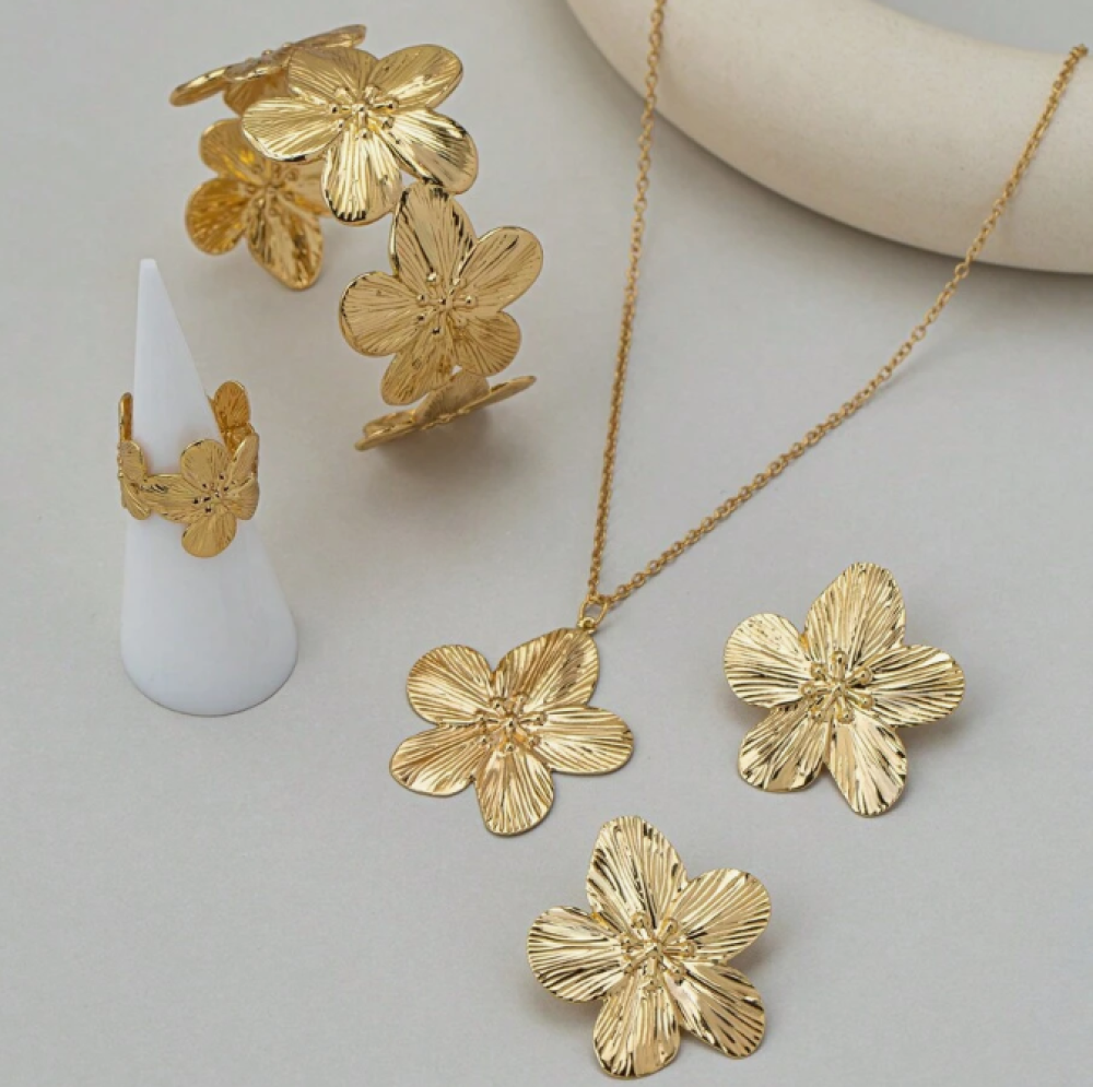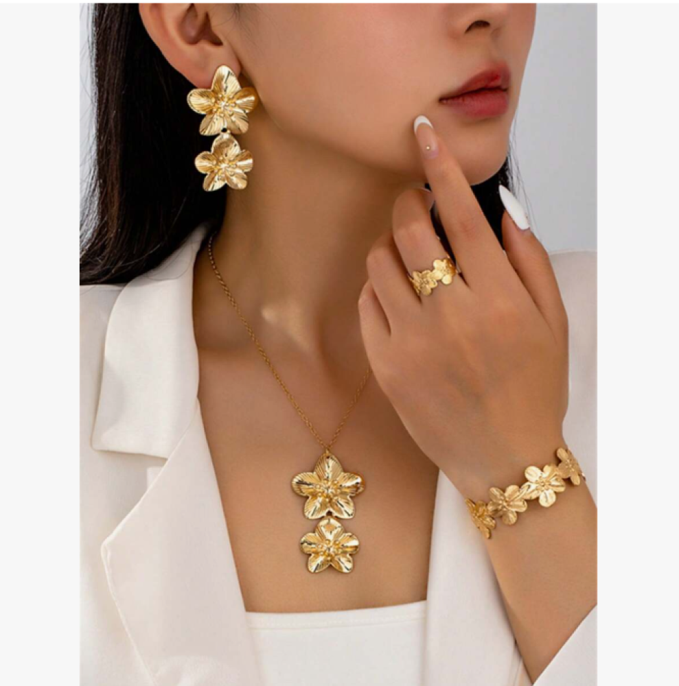 استمتع بإطلالة ساحرة مع مجموعة اكسسوارات ذهبية علي شكل ورد5 قطع من متجر trend-stylee. هذه المجموعة تتضمن سلسلة وزوج حلق وخاتم وأسوارة، وهي مثالية لإضفاء لمسة من الأناقة على أي مناسبة.