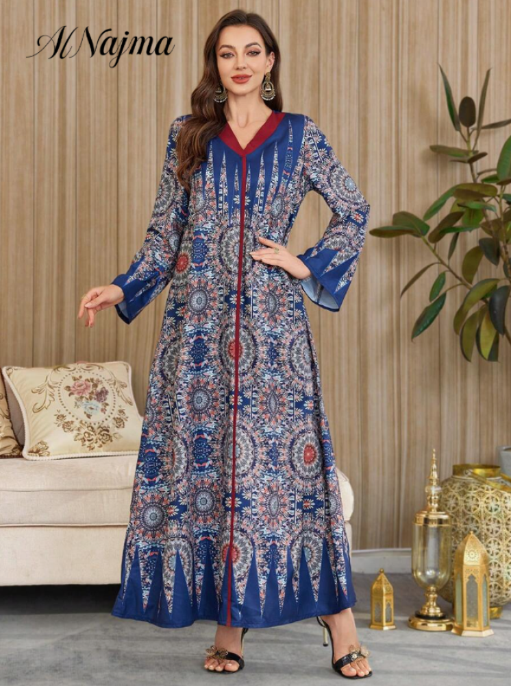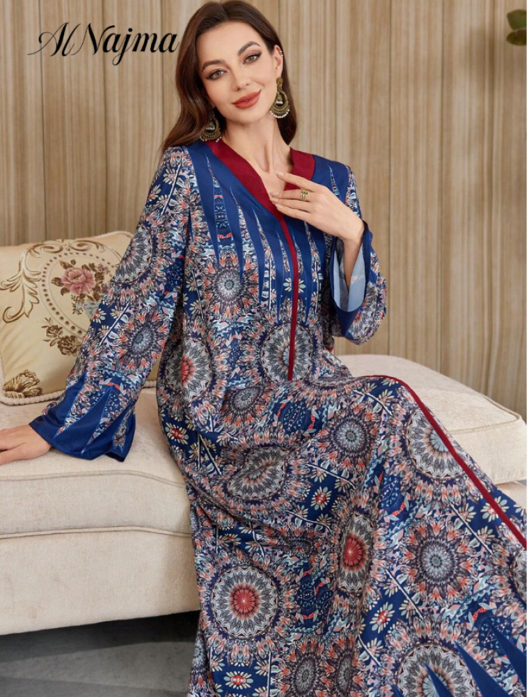 جلابيات نسائية بطبعة زهور وياقة على شكل حرف V وأكمام طويلة